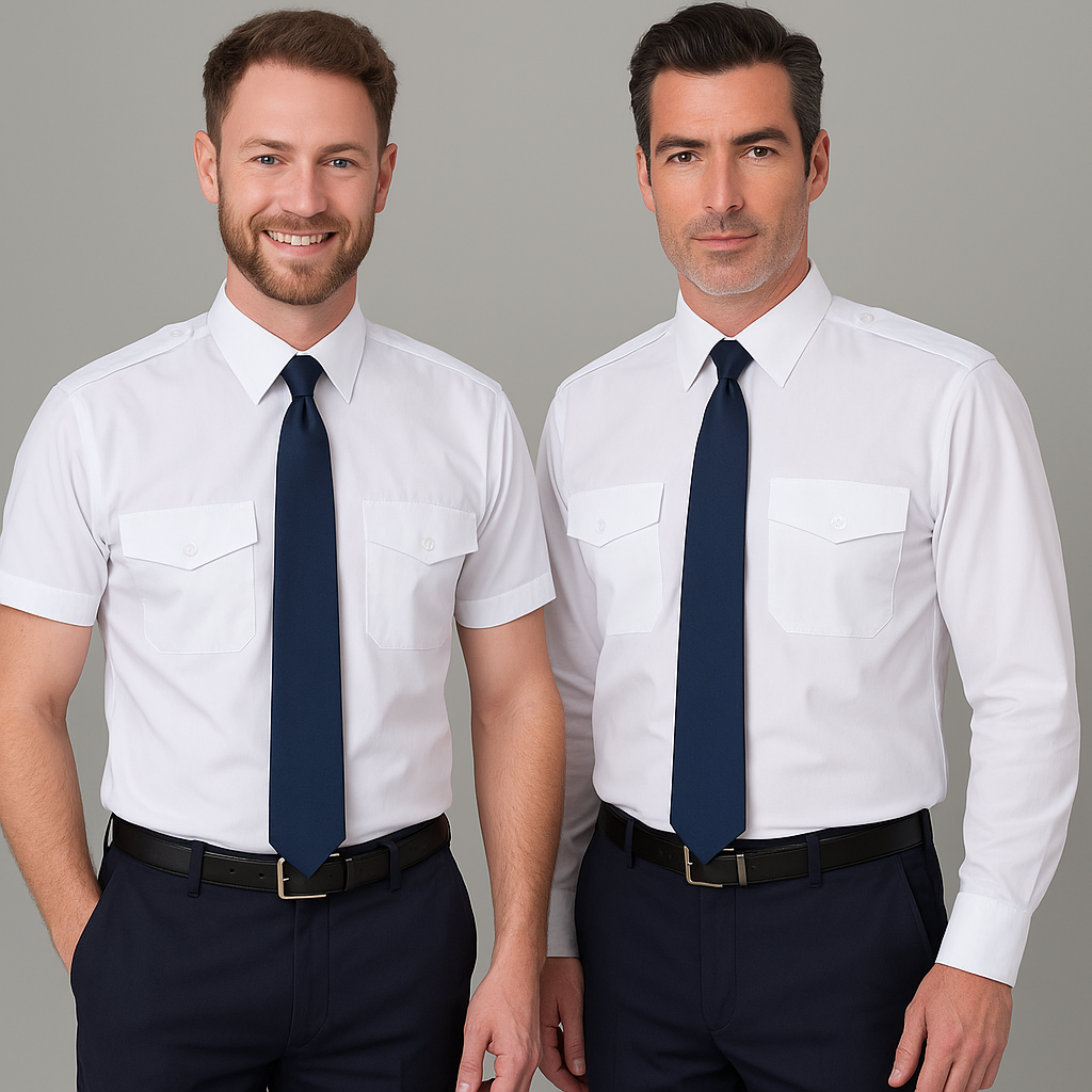 Due to the closer fit, these shirts may feel more snug in confined workspaces — such as aircraft cockpits. In such cases, we recommend considering one size up to maintain comfort without compromising style.